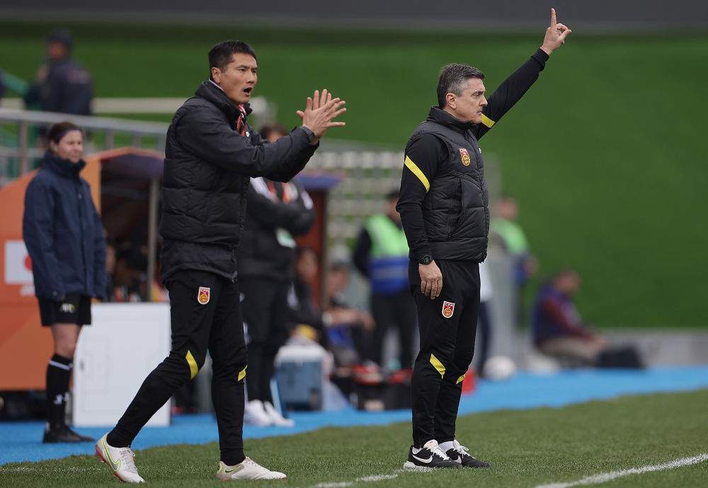 3月3日,中国U20男足主教练安东尼奥(右)与领队邵佳一在场边指挥。新华社发(车周勇 摄)